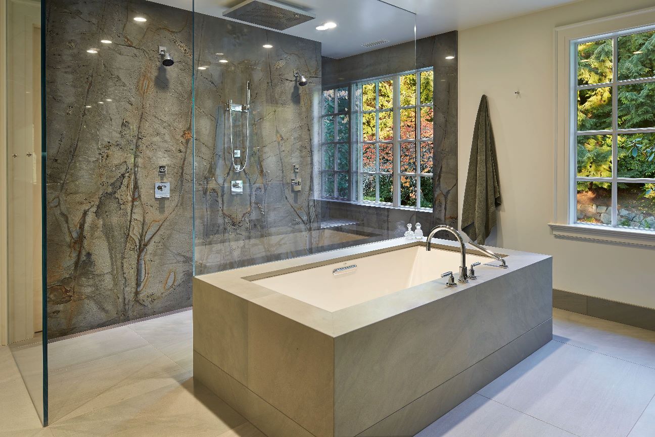 We used a combination of 1/2” clear tempered and 1/2” satin etch glass; the etched glass created more privacy for the water closet area.